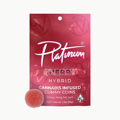 Platinum Cherry (Hybrid) Gummy Coins 100MG Cherry Gummy coins offer a sweet and delicious cherry flavor in every bite. Whether you're looking to unwind, enhance your creativity, or simply enjoy a relaxing moment, these gummies deliver a balanced, smooth high. Platinum gummy coins are packaged 10 pieces in each bag at 100mg THC per bag. Effects: The perfect combination of uplifting but also relaxing for keeping you focused but also giving an uplifting high