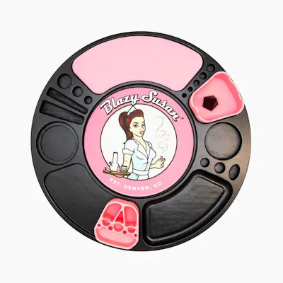The Blazy Susan Spinning Rolling Tray features an innovative design with small compartments for all different types of accessories and supplies! Ultra-Convenient Design Fully-Printed Artwork Custom Slots for Organizers & Inserts Smooth Spin for Easy Access Organize Your Sesh