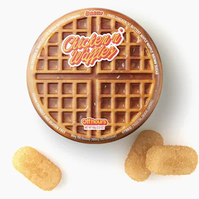 FLAVOR: Chicken and Waffles SIZE: 10CT STRENGTH: 100MG THC (10MG/SERVING) YES, it’s real... Off hours “Chicken N’ Wafflez Live Rosin Gummies turn the joke into something seriously good. (We didn’t think it would work either) Vegan fried chicken, buttery maple waffle, and a brown sugar crunch that somehow works. Productive, creative and euphoric. Enjoy. SUGGESTED USE: Start with 1/2 of a gummy. Wait 1 full hour before increasing dose. INGREDIENTS: Organic Cane Sugar, Reverse Osmosis Water, Organic Tapioca Syrup, Organic Fruit Juice from Concentrate, Fruit Pectin, Organic Fruit Flavoring, Natural Food Coloring, MCT Oil, Cannabis Extract, Malic Acid, Sunflower Lecithin