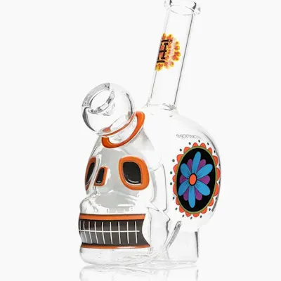 Celebrate in style with the HEMPER Dia De Los Muertos Skull Bong, a truly eye-catching piece that pays homage to the vibrant Día de Los Muertos tradition. This 6.1" glass bong features a uniquely artistic skull design, decorated with bold, festive colors and intricate patterns, bringing a blend of culture and craftsmanship to your smoking experience. Made from high-quality borosilicate glass, it is both durable and heat-resistant, ensuring long-lasting use. Standing at 6.1 inches tall, it's compact for easy portability and comfort, with an angled neck and a well-designed mouthpiece that deliver a smooth smoking experience. This artistic piece doubles as a striking decorative item and a conversation starter, making it perfect for collectors and those who appreciate functional art. Whether used at home or on the go, its blend of style and practicality, along with its cultural significance, makes it a standout addition to any collection and an ideal gift. Get ready to enjoy your sessions like never before!SPECS:Height: 6.1"Diameter: 3"Depth: 3.6"Percolator:45 Degree Recessed 14mm Joint to Straight Diffused PercThickness: 5mmTransparent Clear Skull