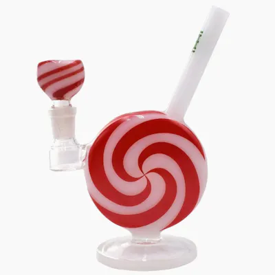 What a treat! The Hemper team is happy to present this festive Jollipop bong. It features the unmistakable and iconic red and white swirl of the peppermint candy Jollipop. This Bong looks, holds, and hits as cool as can be. The removable bowl has a matching swirly stripe too. SPECSFrosted Glass design featuring a red and white swirl of the peppermint candy JollipopDiffused Stem PercolatorHeight: 7" tallBase Diameter: 3"