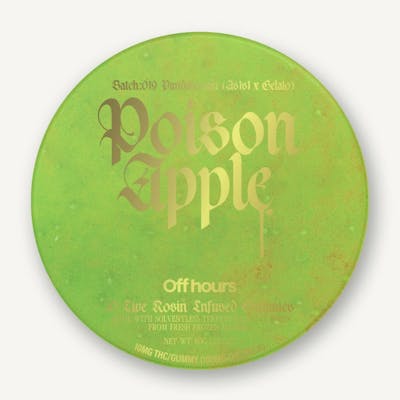 Pandalorian “Poison Apple” Live Rosin Gummies: Flavor: Sour Apple + Cherry + CranberryTerpenes: Terpineol, Linalool, Limonene, a-TerpineneSize: 10ct Strength: 100mg THC (10mg/serving) Give into temptation with Off Hours Pandalorian “Poison Apple” Live Rosin gummies. These sinisterly delicious sour apple, cherry, and cranberry gummies pair perfectly with Pandalorian’s berry sweet rosin for an irresistibly relaxing and euphoric high.Suggested use: start with 1/2 of a gummy. Wait 1 full hour before increasing dose. Ingredients: Organic Cane Sugar, Reverse Osmosis Water, Organic Tapioca Syrup, Organic Fruit Juice from Concentrate, Fruit Pectin, Organic Fruit Flavoring, Natural Food Coloring, MCT Oil, Cannabis Extract, Malic Acid, Sunflower Lecithin