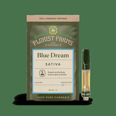 Blue Dream | Sativa | 1G Vape CartridgeAbout This ProductIf you’re looking for a cart that actually tastes like cannabis, this is it - no added flavors, just real, pure cannabis that hits smooth every time.Effect: SativaFlavor: Sweet and piney with a berry finishIngredients: 100% Pure Cannabis Oil and Cannabis TerpenesWhy We Love Florist FarmsLocated in Cortland, NY, Florist Farms is committed to sustainability. They practice regenerative farming by growing in living soil, using organic compost, and never using pesticides. For over a decade, they have been organic vegetable farmers and donate produce weekly to help support their community. Our friends at Florist Farms are deeply committed to quality and to delivering the cleanest cannabis products in New York State.No artificial flavoring • No botanical terpenes • Zero cutting agents