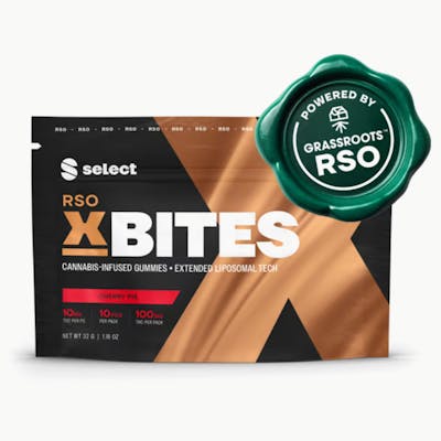 Cherry Pie RSO X-Bites - Select delivers another cutting-edge fan favorite with RSO XBites. Enhanced with Grassroots Full-Spectrum RSO, this Xtremely delicious bite provides a punch of sweet flavor and a full spectrum of plant benefits in edible form. Add in our proprietary Extended Liposomal Technology, and you’ve got a full spectrum RSO edible that is quicker hitting, stronger, and longer lasting. Welcome to cannabis elevated. Each RSO XBite contains 10mg, with 10 bites per 100mg pack