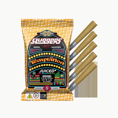 HYBRID Temptation is a hybrid strain that blends the smooth genetics of Ice Cream Cake and Jealousy. Its flavor profile is a rich mix of mint, sweet, and creamy notes that tantalize the taste buds. This strain offers a relaxing yet uplifting high, making it perfect for unwinding while staying motivated. Sluggers JUICED* 5-Pack Blunts come Triple-Infused with Premium Flower, Solventless Hash, Diamonds, High Terpene Extract, and rolled in kief. Each pack comes with 5 hard hitting JUICED blunts and an exclusive collectible card, sealed in an air tight, golden holographic tin and mylar for long lasting freshness and quality. • Single Source • Whole Ground Bud - Never Trim • Quad Infused: with Diamonds, Hash, and High Terpene Extract, and Kief • Rolled in Kief • Blended Hemp Blunt Wrap • Hand Trimmed, Hand Packed • 5pk of 0.7g Joints = 3.5g Total • Collectible Card Inside • Sealed for freshness • Convenient, Air Tight, Tin