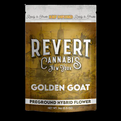 HYBRID Golden Goat is a balanced hybrid known for its bright, tropical flavor and smooth uplifting effects. This preground flower is infused with kief to enhance potency and deliver a richer, more consistent smoke. Ready to roll, pack, or load straight from the bag, this 14g option offers convenience without sacrificing strength. Expect a balanced high that blends light energy with a relaxed finish.