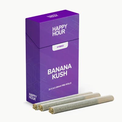 Happy Hour Banana Kush 10 x 0.5g Pre-Rolls bring legacy genetics to life in a smooth, straight-cut format. This iconic hybrid - a cross of Ghost OG and Skunk Haze - delivers lush tropical sweetness with creamy banana overtones, rooted in decades of classic cannabis culture.
