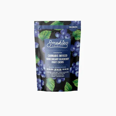 NEW! Smokiez Edibles - Sour Dreamy Blueberry CBN Trifecta Fruit Chews two piece Smokiez Fruit Chews are NOT YOUR AVERAGE GUMMIES™ These delicious Fruit Chews are a tasty and satisfying way for your customers to medicate! They are handcrafted and also Vegan, Gluten Free, Dairy-Free, and contain NO High Fructose Corn Syrup. Each of our mouth watering Fruit Chews contain 10mg CBN, 10mg CBG of and 10mg THC per piece, and made with our high clarity cannabis distillate for great taste. There are 10 pieces per package with 100mg CBN, 100 mg CBG, and 100mg active THC and per package. SO... WHAT IS CBN? Cannabidol (CBN) is a mildly psychoactive compound in marijuana and is unique to the plant. According to Steep Hill Labs, Cannabinol is the most sedative known cannabinoid, which makes it an ideal cannabinoid for a solid night of sleep. source: https://www.steephill.com/blogs/34/Cannabinol-(CBD):-A-Sleeping-Synergy