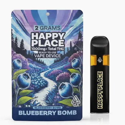 A Berry Lover’s Dream Explode your senses with Blueberry Bomb, packed with rich, juicy blueberry flavors and just the right amount of tartness. This perfectly balanced vape is a must-try for any berry lover, offering a sweet and slightly tangy experience that will leave you craving more. Flavor Profile: *Rich and juicy blueberry *Slightly tart berry undertones *Sweet, satisfying burst of flavor Effects: *Calming and stress-relieving *Eases tension with a subtle boost of joy *Great for unwinding after work Get High. Get Happy. Find Your Happy Place. At Happy Place, we believe cannabis is more than a product—it’s your gateway to better days, brighter moods, and unforgettable experiences. Our mission is simple: to help you find your Happy Place, wherever that may be. Why Happy Place? Premium Potency : With over 1000mg+ TCC (Total Cannabinoid Content), our products deliver the powerful, satisfying experience you deserve. Convenience Redefined : Our 2-gram All-In-One vape devices offer long-lasting use and ultimate ease of enjoyment. Unrivaled Flavor : From tropical sweetness to berry-rich goodness, each strain is crafted to tantalize your senses with exceptional taste.Happy Place isn’t just a brand—it’s a lifestyle. Whether you’re seeking energy, creativity, or a little tropical escape, our products are designed to elevate your mood and transport you to your personal paradise.