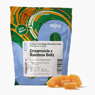 Indica 10mg per gummy. 100mg per pack. Terpene-rich edibles at an even tastier price. Introducing our live resin Creamsicle x Rainbow Beltz gummies. These vegan gummies are infused with MFNY’s single-source, in-house produced Rainbow Beltz live resin.