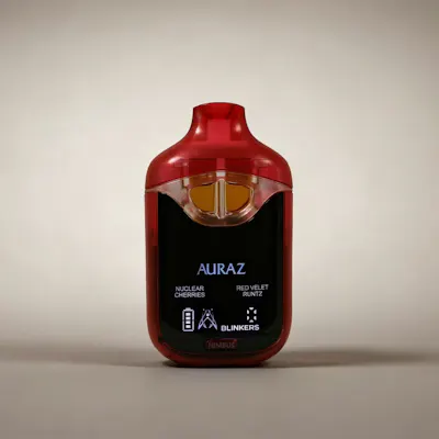 The Auraz Nimbus is a 2g dual-chamber Liquid Diamond disposable designed for precision and smooth delivery, featuring a digital display and usage tracker for consistent hits every time. This release pairs Nuclear Cherries with Red Velvet Runtz, blending rich fruit and dessert-like flavors into a balanced, indica-leaning experience. Nuclear Cherries is an indica-dominant strain with a bold cherry-and-tropical-fruit aroma layered over earthy spice. Its flavor is sweet and bright, mixing ripe cherry with citrus before finishing smooth and lingering. The high delivers calming euphoria that eases tension while uplifting the mind, often chosen for relief from pain, anxiety, muscle spasms, depression, inflammation, and insomnia. Red Velvet Runtz complements with a candy-like cherry profile infused with creamy chocolate notes, evoking the nostalgia of red velvet cake topped with sour cherry candies. Its effects start with a tingly, uplifting head high that sparks happiness and bliss before settling into a soothing body buzz. As relaxation deepens, a gentle couch-lock may set in—perfect for winding down or sneaking in a restorative nap. Together, these strains create a smooth, flavorful vape ideal for unwinding with a sweet twist.
