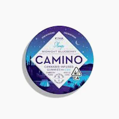 Kiva Confections presents Camino - Indica - 5:1 Midnight Blueberry "Sleep" Gummies, a premium edible designed for ultimate relaxation. Each pack contains 20 gummies, delivering a total of 100mg THC and 20mg CBN. Infused with soothing terpenes and enhanced by the calming properties of chamomile and lavender, these gummies are perfect for promoting restful sleep. The key ingredient, CBN, works synergistically with THC to provide a deeply relaxing experience. Enjoy the delightful taste of midnight blueberries while unwinding after a long day. Ideal for those seeking tranquility and a peaceful night's rest, Kiva's Midnight Blueberry Gummies are your go-to solution for sleep support.