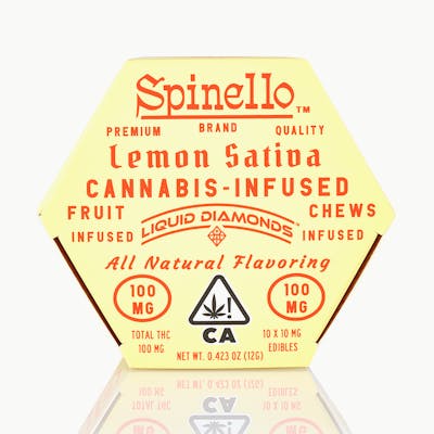 Enjoy Spinello! Served in a stay-fresh case, our delicious Lemon Sativa fruit chews are infused with premium Gold Drop Liquid Diamonds™ live-resin in an easy dose, break-away gummy. Vegan, gluten-free, and made with all-natural flavors, each fruit chew contains 10mg THC per serving, with 100mg THC total per package. -- Taste the difference today.