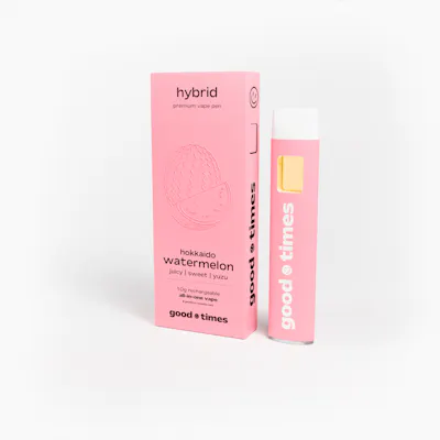 high-potency - experience the juicy, sweet taste of hokkaido watermelon—brightened with a hint of yuzu, inspired by japan’s northern coast—in a sleek 1.0g all-in-one vape. crafted with pure cannabis oil and natural terpenes, this hybrid delivers smooth draws, balanced effects, and fast-acting relief. powered by state-of-the-art hardware—including a postless ceramic heating element, proprietary airflow system, and rechargeable design—it ensures dense vapor, vibrant flavor, and consistent performance every time. – all good times lab results are available under each product at www.goodtimes.flowers flavor: juicy | sweet | authentic watermelon effect: daytime clarity, perfect for focus with a fresh lift, ideal for creative and social flow