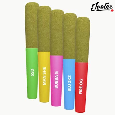 Get ready, Canada! Jeeter is making its grand debut in the Great White North. Baby Jeeters promise an experience that's anything but small. Every meticulously crafted pre-roll is infused with diamonds, crowned with a layer of kief and charged with a burst of unparalleled flavour. Embrace the best, Canada. Jeeter has landed. Experience our first drop of Baby Jeeter flavours in a single multipack. Exclusive to Canada, this assortment brings together Blue ZKZ, Fire OG, Strawberry Sour Diesel, Bubba G and Mango Sherbs for an unparalleled tasting experience.
