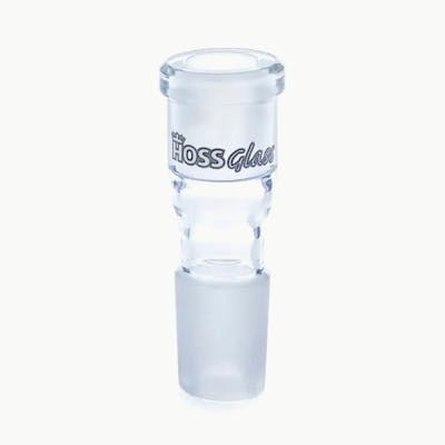 Connect your favorite pieces together with the Straight Glass Adapter by Hoss Glass. The bottom connects as a 19mm male and the top as a 14mm female piece. Perfect for connecting bowls and ashcatchers. ?Joint Size: 19mm Male to 14mm Female Change the size of your bowl with this adapter