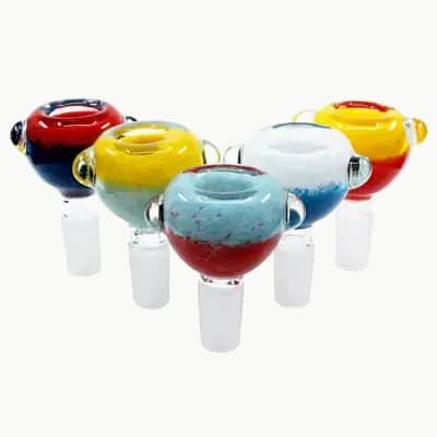 Duo Tone Pebbled Dry-Herb Bowl - 14mm ?Beautiful half and half bowls. These duo tone 14mm dry-herb bowls are colour split in half horizontally. They have a deep dry-herb bowl with 2 pebbles on the sides for easy handling.
