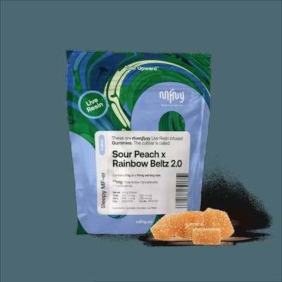 A must for edible lovers, these palate-pleasing Sour Peach x Rainbow Beltz gummies are unlike any other edibles you've tried. Our vegan, full-spectrum, cultivar-specific gummies are infused with MFNYโs premium Rainbow Beltz live rosin extract. Superior to distillate, live rosin is made via solventless extraction from premium fresh frozen plants, preserving all the natural terpenes. We use the minimum amount of sugar to highlight the fruity and candy flavors of the Rainbow Beltz, paired with natural flavors of sour peaches.