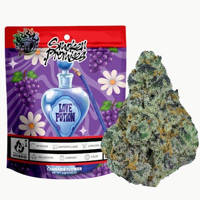 Love Potion 3.5g Flower by Smoken Promises – Balanced Hybrid with Citrus-Floral Flavor Now available at Holistics Cannabis Dispensaries Love Potion by Smoken Promises is a well-balanced hybrid that offers a smooth blend of uplifting mental clarity and gentle body relaxation. This 3.5g premium flower is a cross between G-13 and Santa Marta Colombian Gold, resulting in a unique terpene profile that delivers zesty citrus, sweet floral notes, and a subtle herbal finish. Carefully cultivated and cured, Love Potion lives up to its name with an aromatic, flavorful smoke that’s as enjoyable as it is functional. Effects & Ideal Use Love Potion delivers a clear-headed, euphoric buzz followed by a calming body effect—ideal for both daytime and early evening use. It’s popular among consumers looking to elevate mood, spark creativity, or simply unwind without heavy sedation. Whether you’re out with friends or winding down at home, this hybrid offers a versatile high that keeps you engaged and relaxed. Why Choose Love Potion by Smoken Promises Bright, citrus-floral flavor with a smooth, clean burn Balanced hybrid effects: uplifting yet calming Expertly grown and cured for premium flower quality Shop Love Potion by Smoken Promises at Holistics Cannabis Dispensaries Order online for in-store pickup or local cannabis delivery. Looking for premium flower near me or a trusted dispensary near me? Holistics carries top-tier hybrid weed like this standout from Smoken Promises.