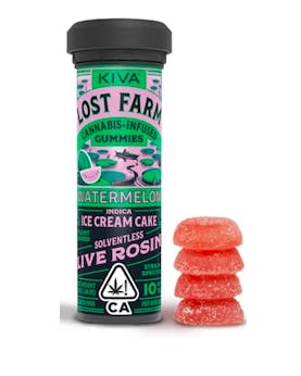 Lost Farm Watermelon Live Rosin Gummies are a premium cannabis-infused edible that combines the delightful flavor of watermelon with the rich, strain-specific benefits of Ice Cream Cake Indica. These gummies are made using solventless live rosin, ensuring a pure and potent product. Each gummy is plant-based, making it suitable for various dietary preferences. Packaged in a convenient container, these gummies are easy to carry and consume, offering a consistent dose of 10 mg per serving. Ideal for those seeking a flavorful and effective cannabis experience.