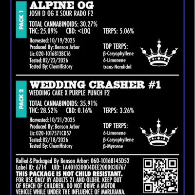 Pre Roll - Benson Arbor - Alpine OG/Wedding Crasher #1 (12 pack)