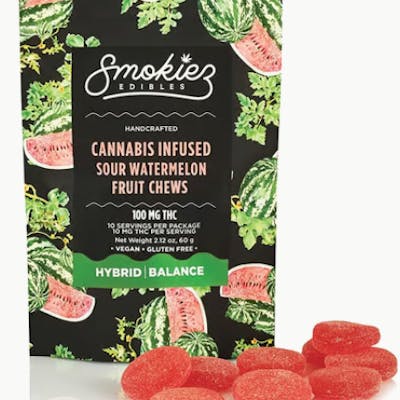 Smokiez Sour Watermelon Hybrid Fruit Chews are NOT YOUR AVERAGE FRUIT CHEWS™ ;) These fruit chews taste like a tart and juicy watermelon, with a pleasant balance of fruity and citrusy notes. These delicious fruit chews are a tasty and discreet way for you to medicate! They are also Vegan, Gluten Free, Dairy-Free, and contain NO High Fructose Corn Syrup. Each of our mouth watering fruit chews contain 10 mg of THC, and made with our high clarity cannabis distillate for great taste. There are 10 pieces per package with 100 mg active THC per package.