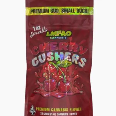 LMFAO Cherry Gushers Smalls is a 28g "value-packed" ounce of pure California bliss. Crossing Acai x Black Cherry Funk, these frost-covered small buds feature a decadent profile of sweet cherry candy, creamy berries, and gassy earth. With its high THC potency and smooth smoke, it delivers a harmonious high of happy euphoria and deep physical relaxation, making it the ultimate budget-friendly choice for shared sessions and blissful nights in.