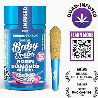 Baby Jeeter. Pocket-sized vibes. In each jar, you'll find a hand crafted, hand rolled 5 0.5-gram Jeeter joints. They're made with premium indoor grown flower, Rosin enhanced diamonds