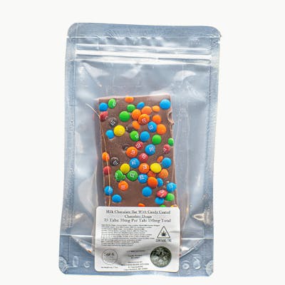 Chocolate Bar with candy coated chocolate pieces. 15 pieces per bar, 10 mg THC per piece.