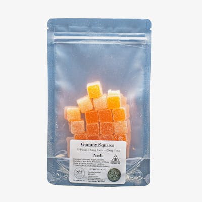 20 Peach flavored gummies per pack. 20 mg THC per gummy, for a total of 400mg per package.