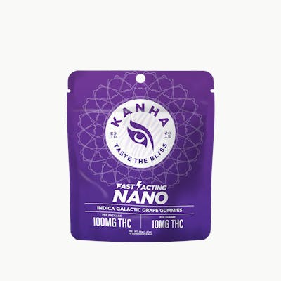 Who needs wine when Galactic Grape Indica gummies deliver the flavor of harvest-ready grapes with reserve-worthy indica oil and terpenes like myrcene, α-humulene and β-caryophyllene. Each soft and juicy gummy contains 10mg of THC and our exclusive NANO technology for faster takeoffs that send you into orbit in minutes. KANHA, the first to introduce fast-acting effects, remains the best with NANO gummies. Instructions: Eat 1 gummy. Onset starts around 5-15 minutes. Wait 60 minutes for full effect. Keep in a cool, dry place. Avoid temperatures over 75°F. Ingredients: Tapioca Syrup, Cane Sugar, Water, Gelatin, Agar, Locust Bean Gum, Carnauba Wax, Natural Flavor, Citric Acid, Natural Color, VESIsorb Nanotech, and Cannabis Oil.