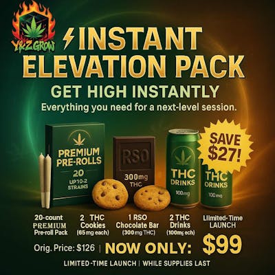 Experience instant elevation with this all-in-one premium cannabis bundle. The Instant Elevation Pack delivers everything you need for a next-level session — perfectly balanced between smoke, edible, and drink formats for both power and relaxation.