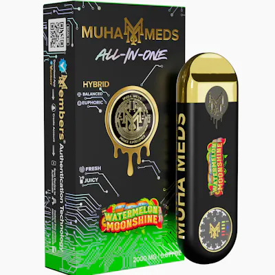 Experience the Muha Meds 2gram Live Resin Disposable Vape Pen in the "Watermelon Moonshine" hybrid strain. This strain offers a balanced blend of relaxation and subtle energy, wrapped in a refreshing watermelon flavor with a hint of spirited sweetness. The aroma evokes a summer's day with juicy watermelon notes that are both invigorating and soothing. Ideal for any time of day, "Watermelon Moonshine" elevates your senses and delivers a harmonious experience that refreshes both body and mind.