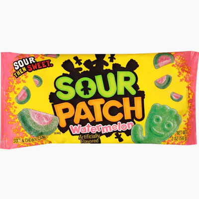 Sour Patch Kids Watermelon are soft, chewy, watermelon-flavored candies with an intense sour-then-sweet profile. Shaped like miniature watermelon slices with red, white, and green coloring, they offer a tart exterior coating that fades into a sweet watermelon flavor. They are a popular, fat-free, summer-themed treat.