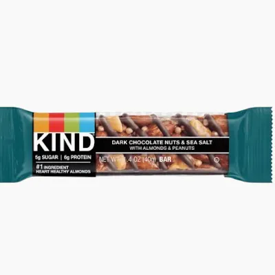 KIND Dark Chocolate Nuts & Sea Salt (1.4 oz) is a gluten-free, nutrient-dense snack bar blending almonds, peanuts, and dark chocolate with a hint of sea salt. Featuring a sweet and salty taste with a crunchy texture, each bar provides 6g of protein, 7g of fiber, and 5g of sugar. It is Non-GMO, low glycemic, and contains no artificial flavors.