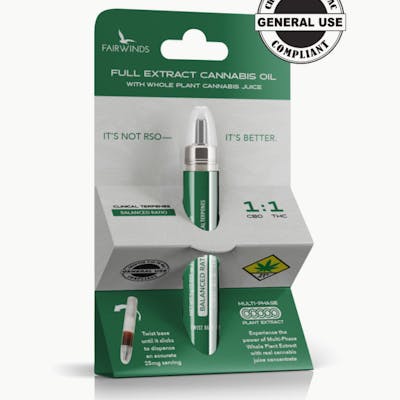 Fairwinds is proud to introduce Washington’s first true Full Extract Cannabis Oil! Utilizing an innovative & multi-phase extraction process, our laboratory has created a comprehensive whole-plant blend, setting a new standard for cannabis concentrates. This ground-breaking production process captures a rich profile of essential cannabinoids, terpenes, and organic compounds normally left out of typical RSO. The additional extraction process yields components such as alkaloids, flavonoids, and polysaccharides found in cannabis juice. One gram of our juice concentrate is equivalent to 200 grams of fresh whole cannabis plant! Leaving the old-school syringe in the past, the FECO now comes in an easy-to-use, discreet pocket pen that guarantees a 25mg serving size with each click. The 1:1 CBD to THC ratio provides a balanced cannabis effect by providing equal parts THC and CBD. The flavonoid-rich oil is blended with our clinical terpene blend to provide an optimal experience. WHY ADD TERPENES? Terpenes play a massive role in determining how different cannabis cultivars affect the folks who consume them. We use a standardized blend of terpenes in our Full Extract Cannabis Oil in order to ensure that each batch is consistent, regardless of the cultivar (or strain) it’s made with!