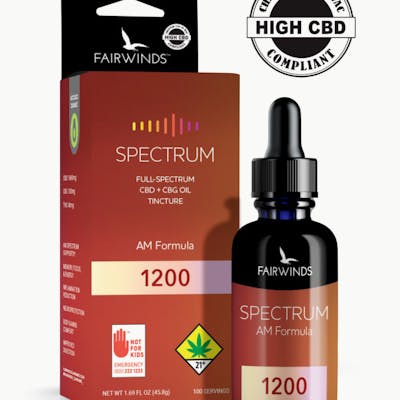 Spectrum 1200 is formulated to provide maximum support and a wide spectrum of benefits. Designed to be non-intoxicating while still leveraging the entourage effects, this tincture is crafted with essential oils, terpenes, herbal extracts, and a full spectrum of cannabinoids. Spectrum 1200 AM is formulated to help jumpstart your day and enhance the wellbeing of your body and mind. The AM formula supports Memory, focus, & energy Inflammation reduction Neuroprotection Body & mind comfort Improved digestion Ingredients: Organic Avocado Oil, Cannabis Oil w/ Terpenes, Essential Oil Blend (White Grapefruit, Lemon, Rosemary, Peppermint), Herbal Extract Blend (Boswellia, Ginger, Turmeric, Huperzia), Natural Mango Flavor Terpenes: Limonene, Caryophyllene, Terpinolene, A-Pinene, B-Pinene, Eucalyptol Potency: Cannabinoids Per Serving: 10.6mg CBD / 1mg CBG / 0.4mg THC Per Package: 1060mg CBD / 100mg CBG / 40mg THC \Why Avocado Oil?: We use avocado oil for its improved health benefits and higher bioavailability. Avocado oil also contains a high supply of healthy, desirable mono-unsaturated and poly-unsaturated fatty acids with a whopping 13% Omega-6 composition, a profile that has been shown to help support wellness. This makes avocado oil more than just a carrier oil; it’s one of the powerful active ingredients! Other tincture mediums are known to suffer from separation and have a high potential for microbial growth, and some are just plain unhealthy to consume. Fairwinds tinctures are formulated with an emphasis on purity and quality, are shelf-stable, anti-microbial by design, and the medium itself provides wellness support. With a soft, smooth, and non-oily feeling, avocado oil provides a clean, natural experience. How to Use: Start by gently squeezing the dropper at the top of the glass tube. Gently remove the dropper from the glass container and measure out to 0.5ml, using the lines on the dropper itself. Place the glass dropper directly under the tongue, and squeeze the rubber top to release the serving of oil. Wait 30-60 seconds before swallowing to allow the oil to fully absorb. The full effects can be expected within 10-30 minutes after the initial serving is administered. Continue to administer more tincture as necessary. Be sure to allow the oil to fully absorb between servings. Note: When sublingually absorbing cannabis oil, the body will naturally absorb each serving with ease when there is less carrier oil.