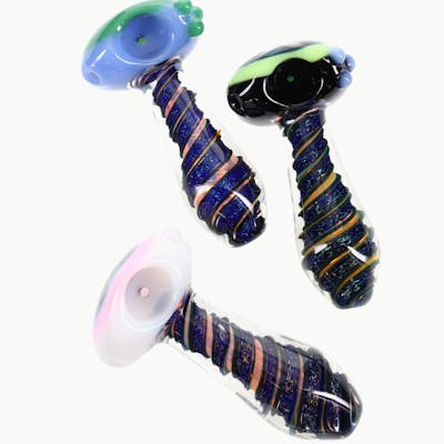 Style & Size: Glass spoon hand pipe • approx. 4" Construction: Thick glass with gold fume for a color-changing effect Design Details: Sparkly dichro spiral • neon rim/striping • reverse wig-wag bowl • marble accents Approx. Weight: ~120 g each