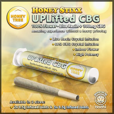 Honey Stixx Infused Joint. Made with indoor-grown flower, these two 0.5g joints are infused and offer a flavorful and high-potency option.-High Potency-Indoor Flower-High CBG Uplift