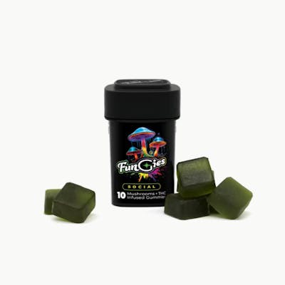 Fungies – Social Line (100mg THC Gummies) Spark connection with Fungies Social — tangy sour apple gummies infused with 100mg THC, CBD, and a social blend of cordyceps, reishi, and ginseng. Designed to boost mood, ease nerves, and keep energy flowing, these mushroom-powered treats are perfect for good vibes and great conversations. 10 gummies per pack, 10mg THC each.