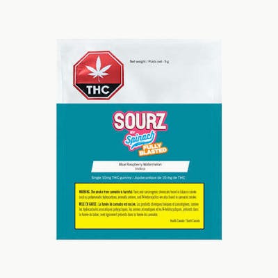 SOURZ by Spinach Fully Blasted Blue Raspberry Watermelon Gummies are packed with 10mg THC per piece. With flavours like electric blue raspberry and refreshing watermelon, send your taste buds soaring. This dual-flavoured gummy is over-the-top with natural flavours and blasted with sour crystals. Enjoy one gummy per pack, 10mg THC total.