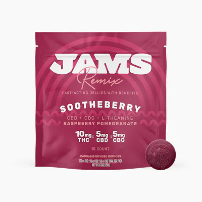 Level up how you wind down with the calming qualities of JAMS Remix Sootheberry Fast-Acting Jellies with Benefits. The harmonious blend of CBD, CBG, and L-Theanine balances mellow vibes with a deliciously bold raspberry pomegranate flavor. Kick back and stack up the smiles with Sootheberry. Each fast-acting ratio jelly contains 10mg THC, 5mg THCV, 5mg CBG with 10 jellies per pack.