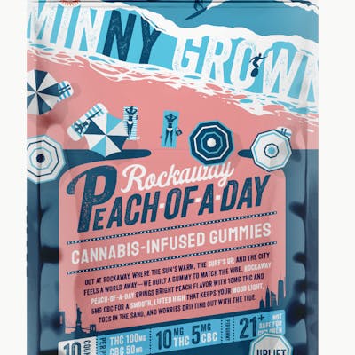 Minny Grown’s Rockaway Peach-of-a-Day gummies are infused with a 2:1 blend of 10mg THC and 5mg CBC, delivering a smooth and lifted high. Perfect for a beach day escape with the sweet taste of sun-ripened peach. Let the tide take it. Per Gummy: 10mg THC, 5mg CBC Per Package: 100mg THC, 50mg CBC (10 Gummies) Vegan & Gluten Free