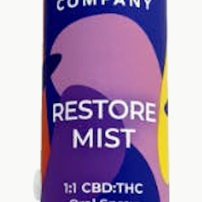 RESTORE MIST 1:1 CBD:THC Approximately 100mg CBD 100mg THC Per Bottle Benefits: Vanilla calms anxiety, elevate mood, encourage mental comfort Orange fosters mental positivity, reduce inflammation and stress
