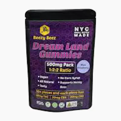 Beezy Beez – Dreamland Gummies Blue Raspberry – 1:2:2 THC:CBN:CBD – 10-Pack (100mg) Drift into deep relaxation with Beezy Beez Dreamland Gummies—your ticket to restful nights and calm, balanced relief. These Blue Raspberry Dreamland Gummies are carefully crafted with a 1:2:2 ratio of THC, CBN, and CBD, designed to promote soothing rest, stress relief, and body relaxation without the heavy high. Each 10-pack delivers a total of 100mg cannabinoids, offering a consistent, gentle dose of hemp-derived cannabinoids in a sweet, tangy blue raspberry flavor. This balanced blend of THC, CBN, and CBD helps calm the mind, ease tension, and support a natural nighttime routine—perfect for winding down after a long day. Made by Beezy Beez, a trusted New York brand known for high-quality, small-batch cannabis wellness products, Dreamland Gummies are lab-tested, precisely dosed, and crafted for reliable relaxation. Product Highlights: Product: Dreamland Gummies – Blue Raspberry Brand: Beezy Beez Ratio: 1:2:2 THC:CBN:CBD