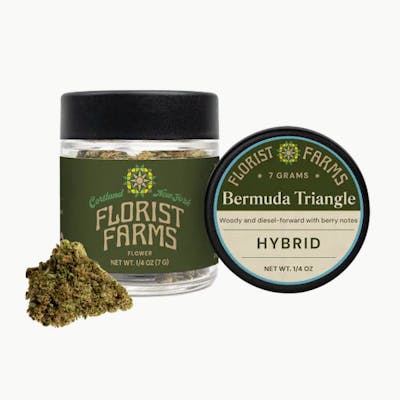 Contents: Sun Grown Flower - (7.0g) Nose/Flavor: Sweet, Citrus, Pineapple, Pine, Spice, Diesel, Earthy Finish Lineage: Ghost OG × Triangle Kush × 88 G13 Hashplant Florist Farms’ Bermuda Triangle delivers a layered experience of Ghost OG × Triangle Kush × 88 G13 Hashplant that leans into both tropical sweetness and classic earthy depth. The aroma opens with bright notes of citrus, pineapple, and sweet fruit—giving it that “lost-in-paradise” vibe—balanced by a grounding mix of pine, spice, and a subtle diesel edge. The flavor tends to mirrors the aroma with being fruity and slightly tangy on the inhale, followed by a smooth, earthy finish that adds weight and complexity. The effects often strike a balanced hybrid middle ground, offering an uplifting, mentally clear buzz paired with a warm, relaxing body sensation that settles in without becoming too heavy.