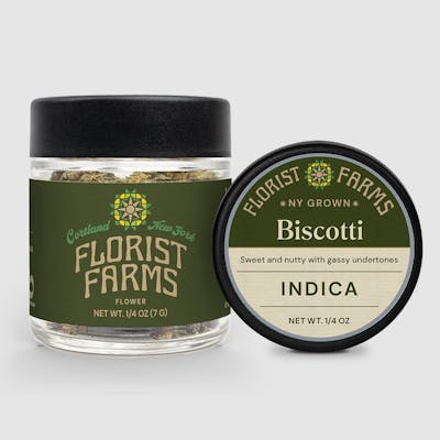 About This Product This quarter-ounce of Florist Farms flower is hand-trimmed, sustainably grown in living soil, and cultivated with care in Cortland, NY. Whether you're rolling up or packing a bowl, expect a smooth, consistent experience rooted in craftsmanship and integrity. Effect: Indica Flavor: Sweet and nutty with gassy undertones Ingredients: Cannabis Flower About Florist Farms Located in Cortland, NY, Florist Farms is committed to sustainability. We practice regenerative farming by growing in living soil, using organic compost, and never using pesticides. For over a decade, we’ve been organic vegetable farmers and donate produce weekly to help support our community. At Florist Farms, we’re deeply committed to quality and to delivering the cleanest cannabis products in New York State. Sustainably Grown • Lab Tested • No Artificial Flavoring • No Pesticides • Non-GMO