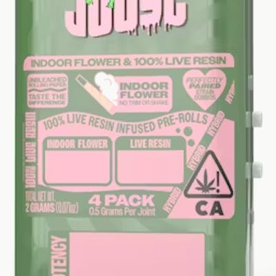 INDOOR FLOWER: Blueberry Cherry LIVE RESIN: Sour Peach 4-Pack of live resin infused pre-rolls - 2 grams per tin, 1/2g per joint :) These lil' guys pack a punch! You get 4 joints of indoor flower infused with pure live resin, packed into a reusable tin that's perfect for on-the-go! PURE AND SIMPLE: Experience the perfect pairing of unique strain combinations with a joint that harmonizes the rich, full-bodied effects of high-quality indoor flower and the terpene-packed punch of pure live resin. It’s a unique experience you’ll fall in love with at first inhale. ;) PRO TIP: For the best experience, slowly rotate the pre-roll while lighting the end and taking gentle inhales. This will ensure your joint burns evenly, helping you avoid the dreaded ‘canoe’.
