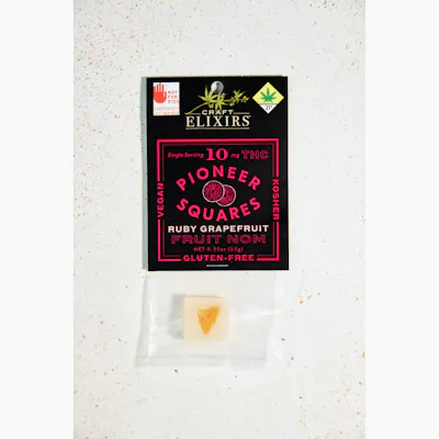 PIONEER SQUARES Ruby Grapefruit THC gummies are gluten-free, vegan and Kosher. Candied artisan fruit candy chew. We start with a tart grapefruit candy chew and add a sweet candied Ruby Grapefruit slice in the middle. It's a little elevation for your mood. Enjoy! 10mgTHC per gummy. Ingredients: Light Corn Syrup, Sugar, Water, Fruit Pectin, Grapefruit, Grapefruit Flavor (Natural Flavors, Sunflower Oil, Safflower Oil, Coconut Oil), Citric Acid, Cannabis Extract, Baking Soda, Canola Oil, Grapefruit Powder (citric acid, grapefruit oil, grapefruit juice), Agar Agar Contains: Coconut