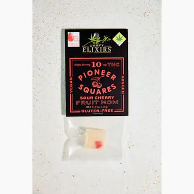 PIONEER SQUARES Sour Cherry THC gummies are gluten-free, vegan and Kosher. Candied artisan fruit candy chew. We start with a tart cherry candy chew and add a sweet candied cherry in the middle. It's a little elevation for your mood. Enjoy! 10mgTHC per gummy. Ingredients: Light Corn Syrup, Sugar, Water, Fruit Pectin, Red Cherries (Cherries, Corn Syrup, High Fructose Corn Syrup, Citric Acid, Red 40, Potassium Sorbate, Sodium Benzoate, Sulfur Dioxide), Baking Soda, Cannabis Extract, Cherry Extract (Natural Flavors, Sunflower Oil), Canola Oil, Citric Acid, Agar Agar